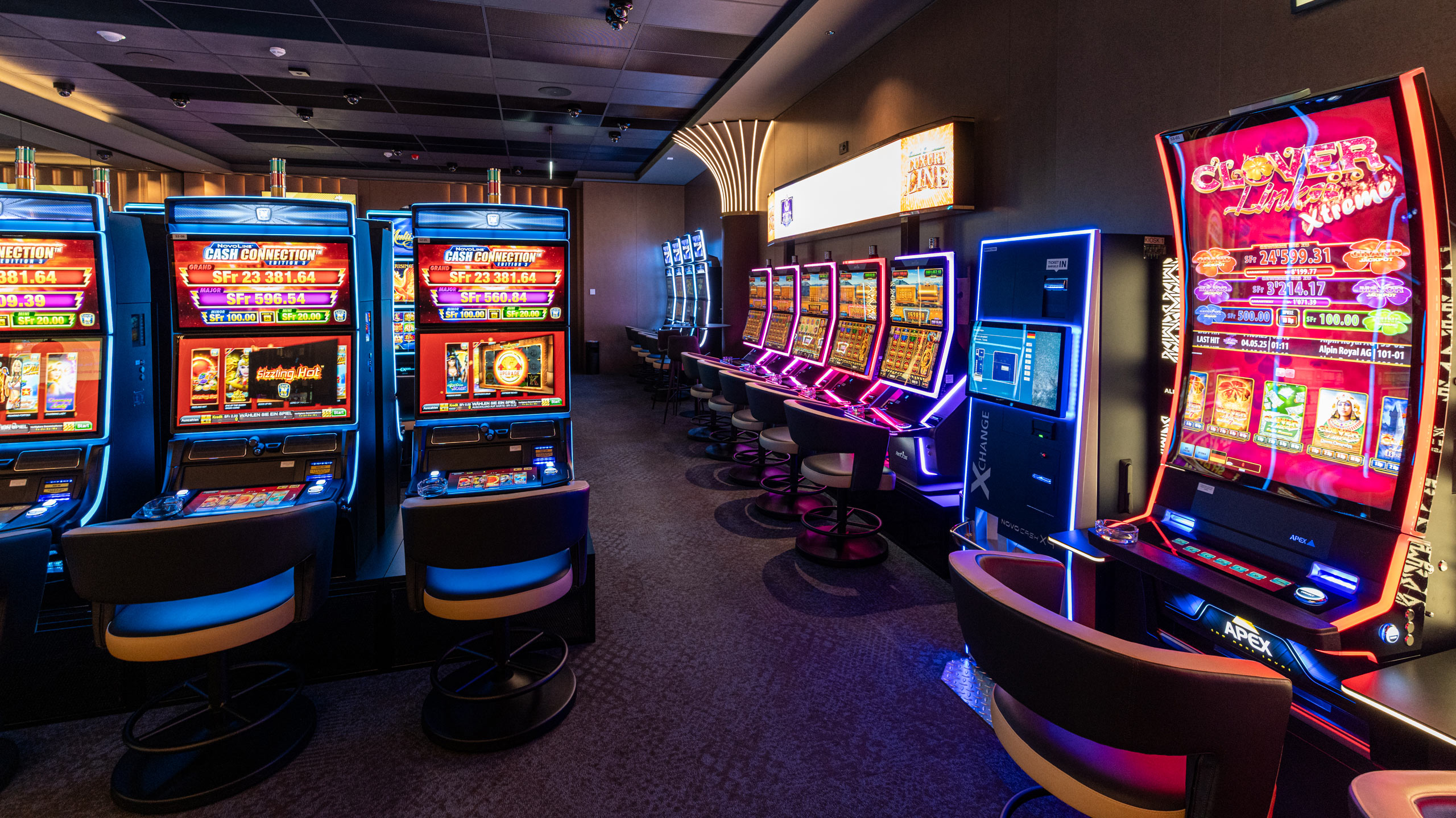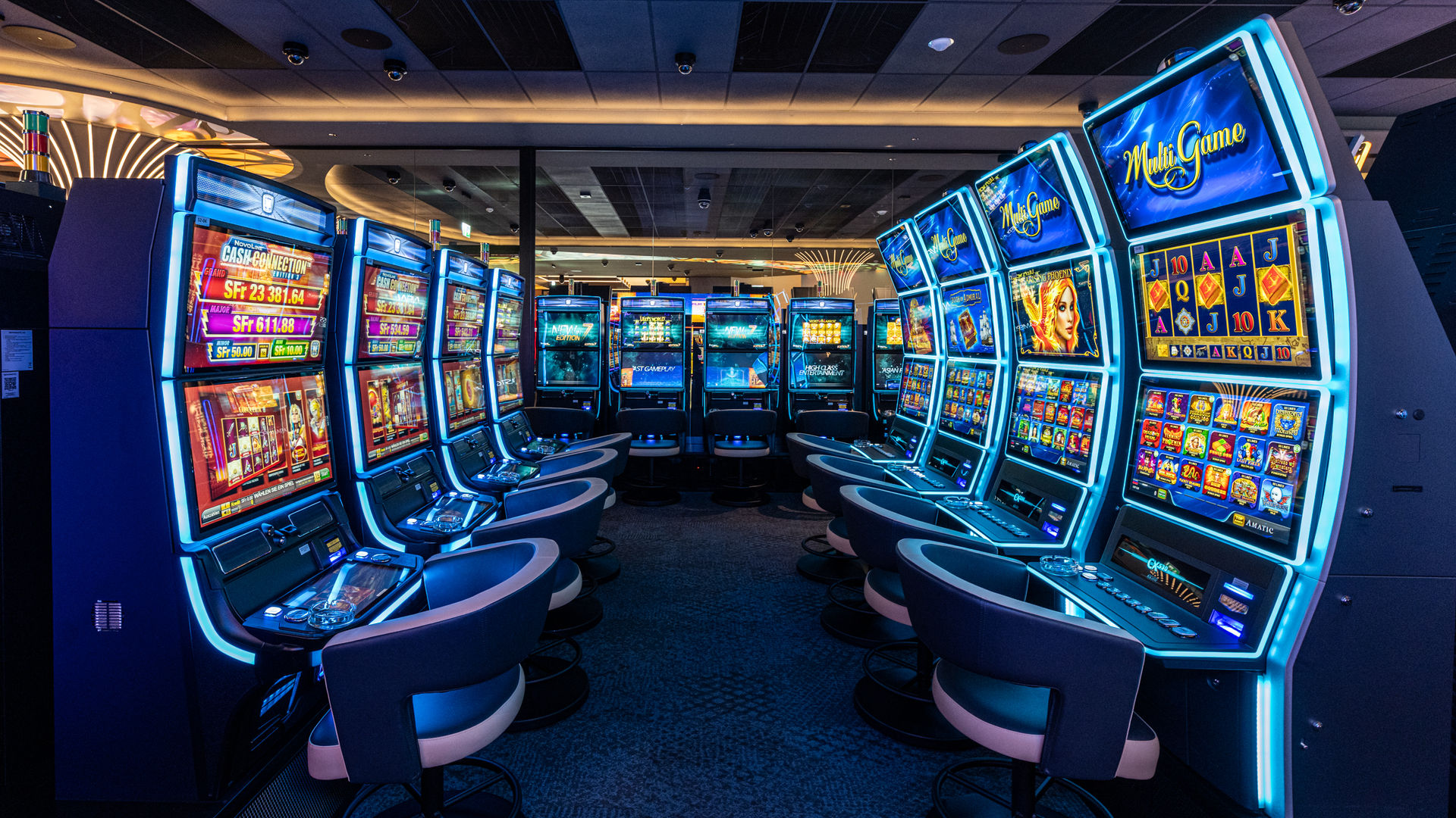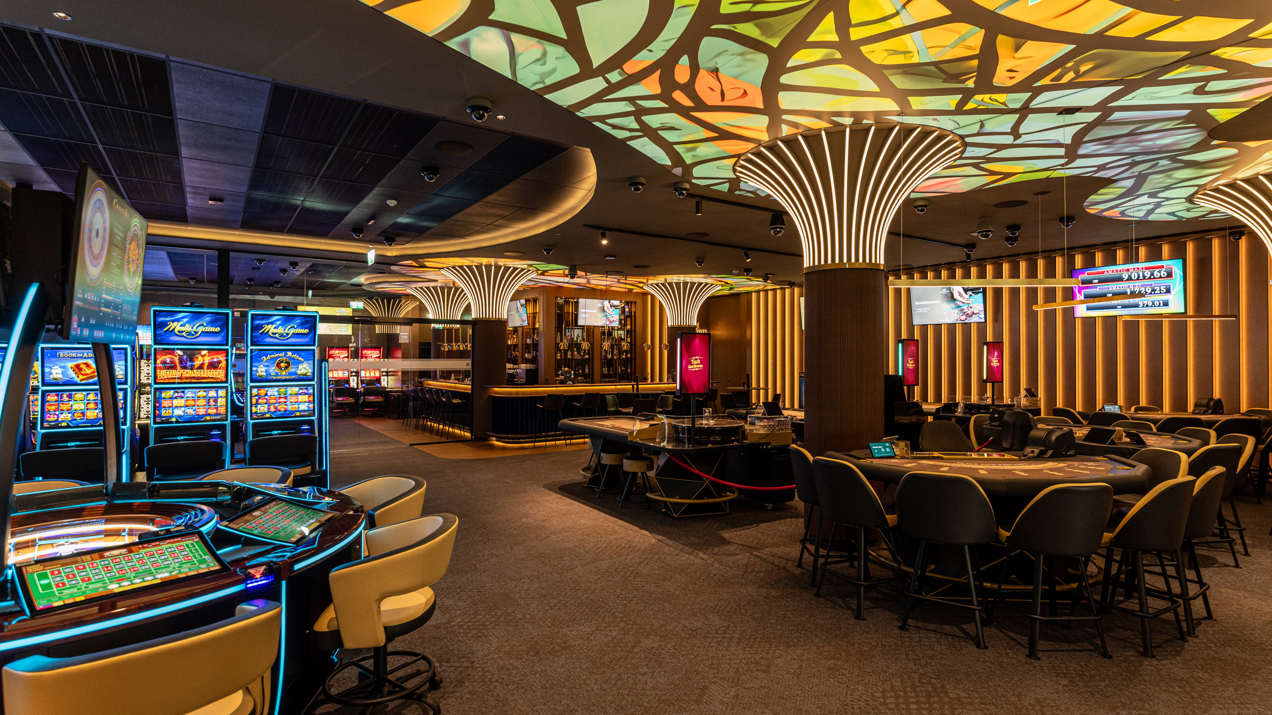 Unser Casino bietet Ihnen 14 Livegame-Tische und 207 topmoderne Spielautomaten renommierter Hersteller – alles für ein unvergleichliches Spielerlebnis. Der grosszügige Spielbereich erstreckt sich über zwei Etagen und umfasst sowohl Automatenspiele als auch Livegame. Für höchsten Komfort stehen Ihnen auf beiden Ebenen Raucher- und Nichtraucher-Bereiche zur Verfügung.