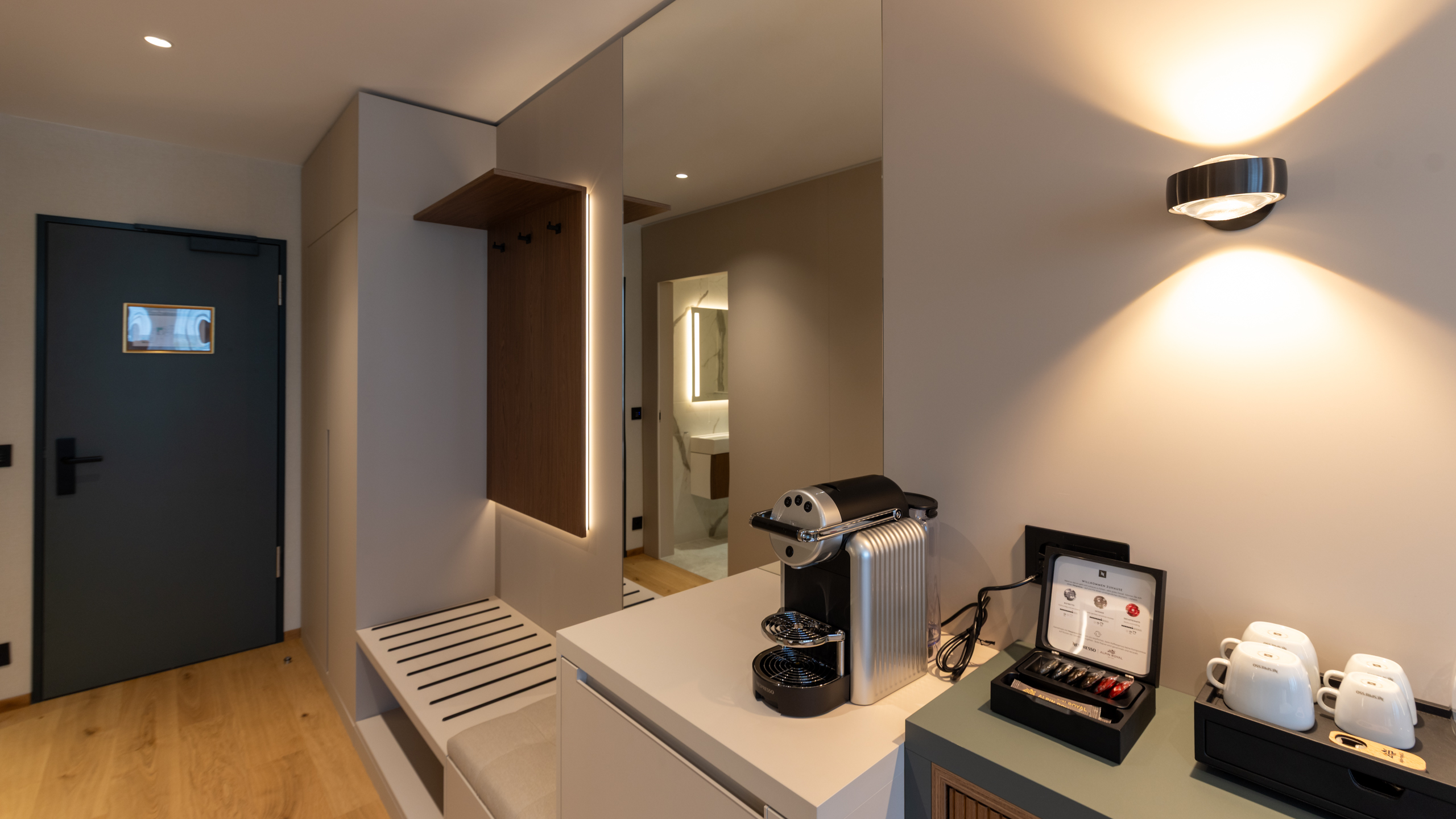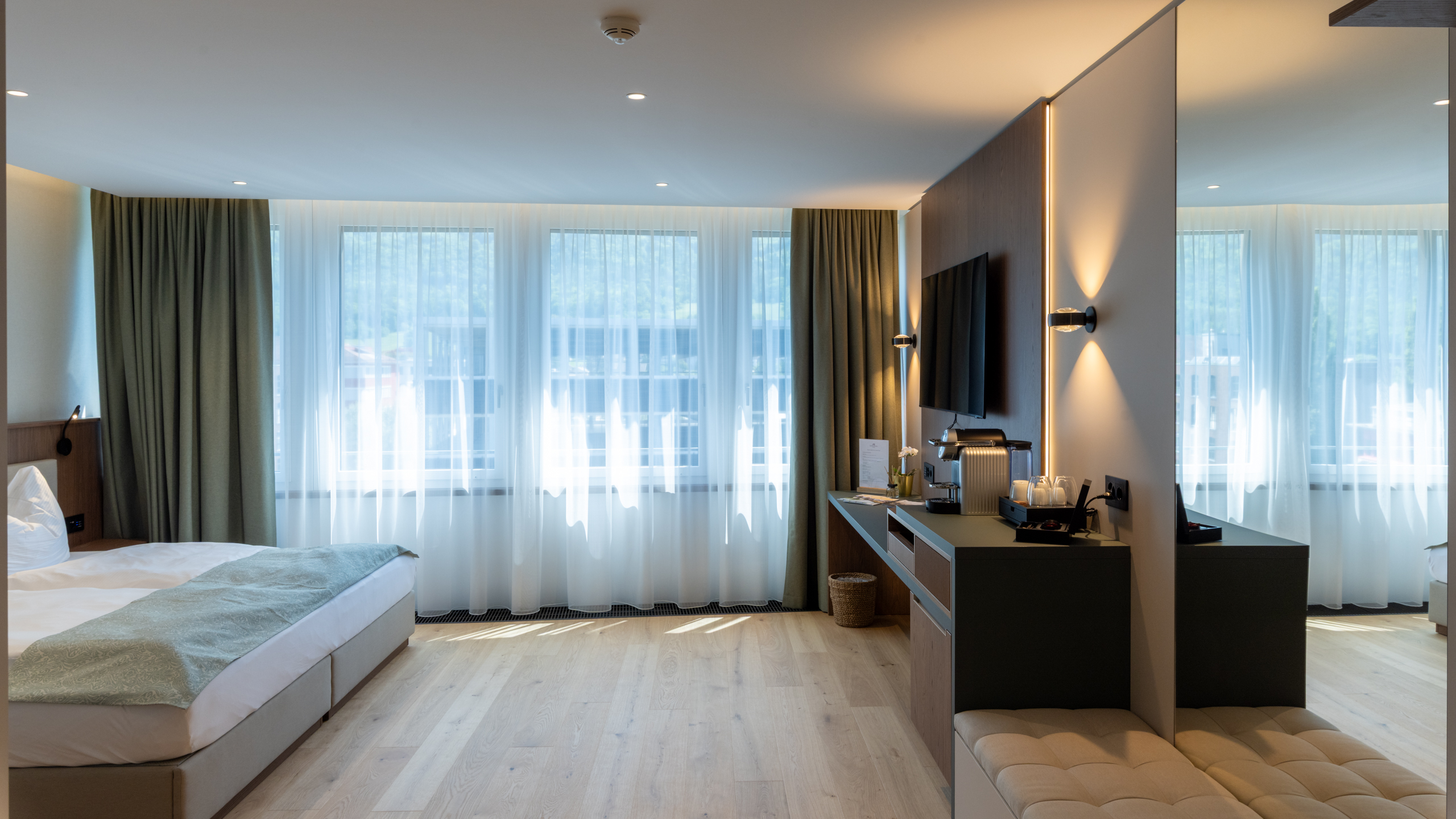 Unsere zwei barrierefreien Zimmer sind perfekt für Gäste mit Mobilitätseinschränkungen. Mit 36 m² Fläche und angepasstem Badezimmer bieten sie grosszügigen Raum und vollen Komfort. Zur Ausstattung zählen ein Kingsize-XXL-Bett, kostenloses WLAN, Nespresso-Kaffeemaschine, Mineralwasser, Flachbild-TV und Alpenblick inklusive. Entspannen Sie sich beim Frühstücksbuffet im Hotelrestaurant und lassen Sie sich abends von der Atmosphäre im angrenzenden Casino verzaubern. Das Frühstück ist im Zimmerpreis inkludiert.