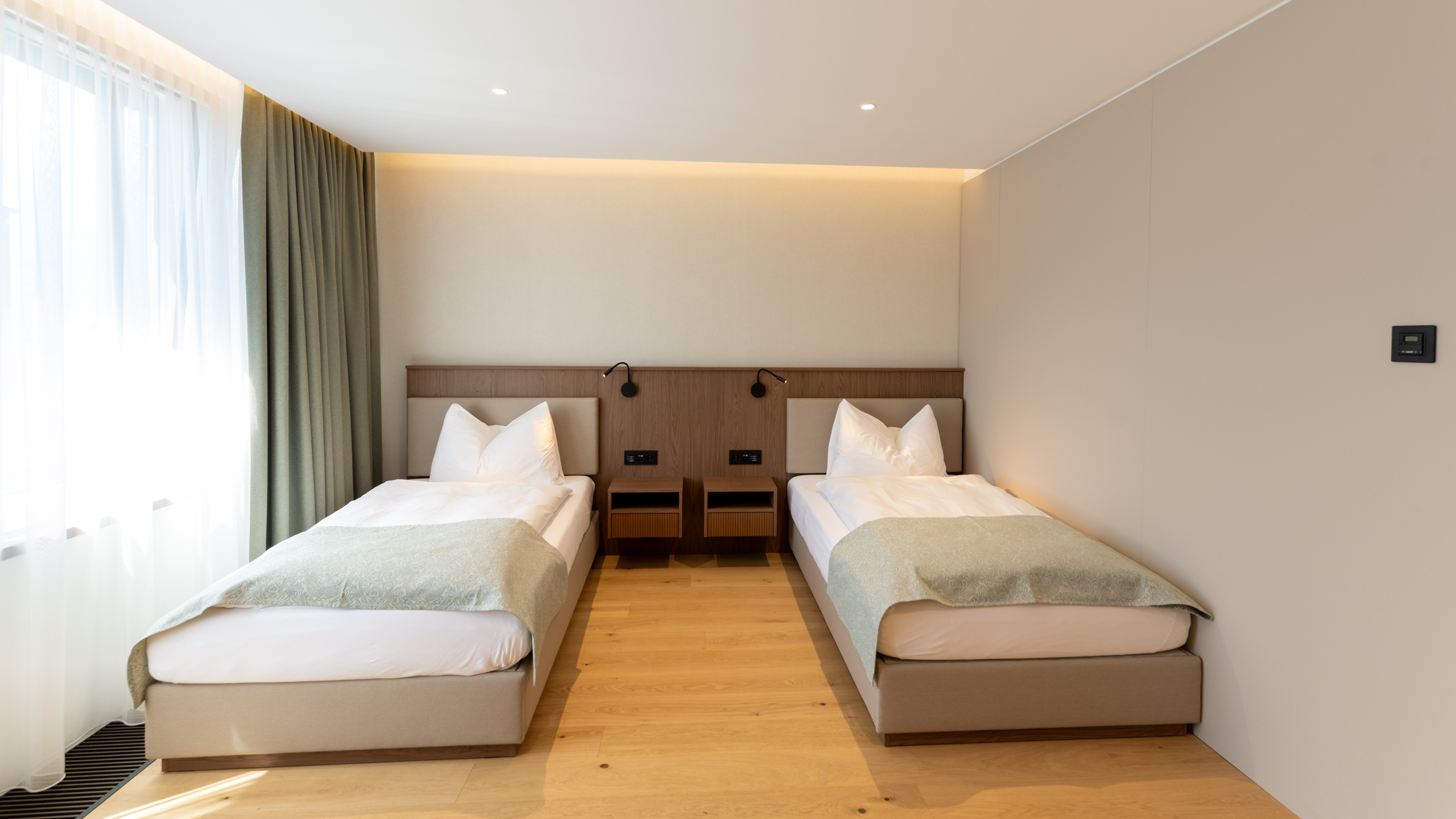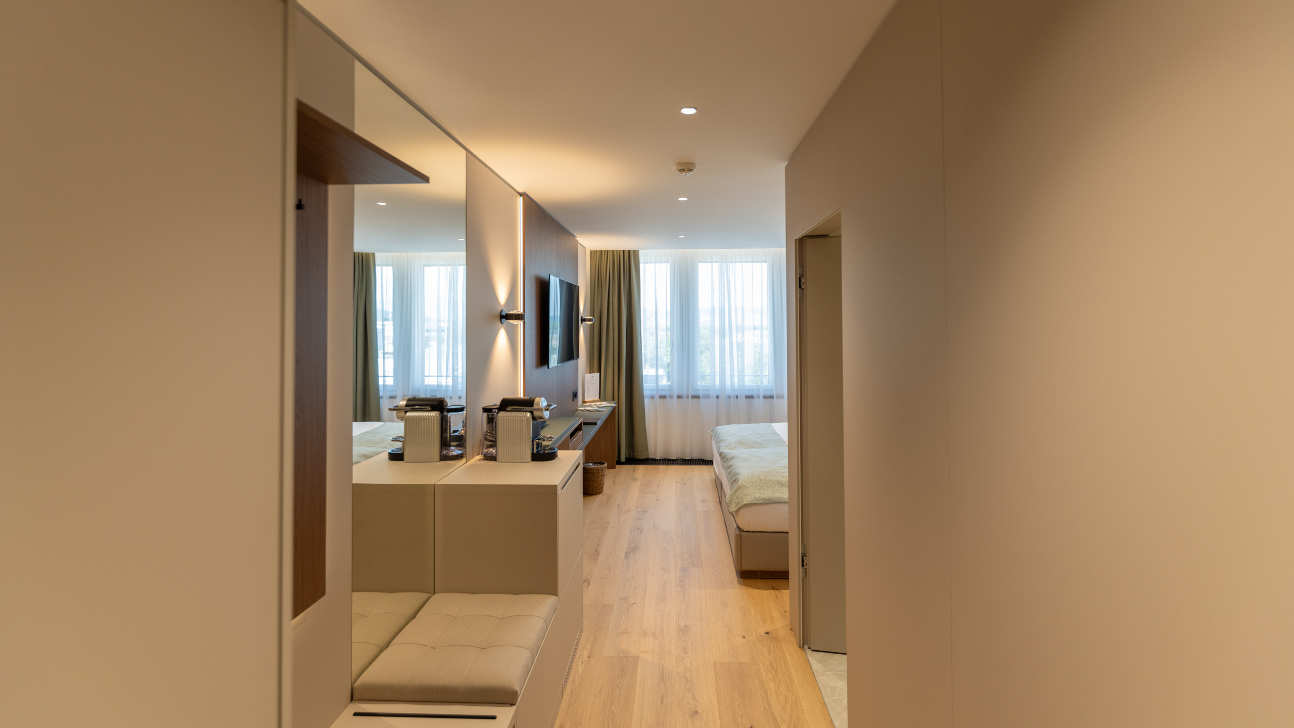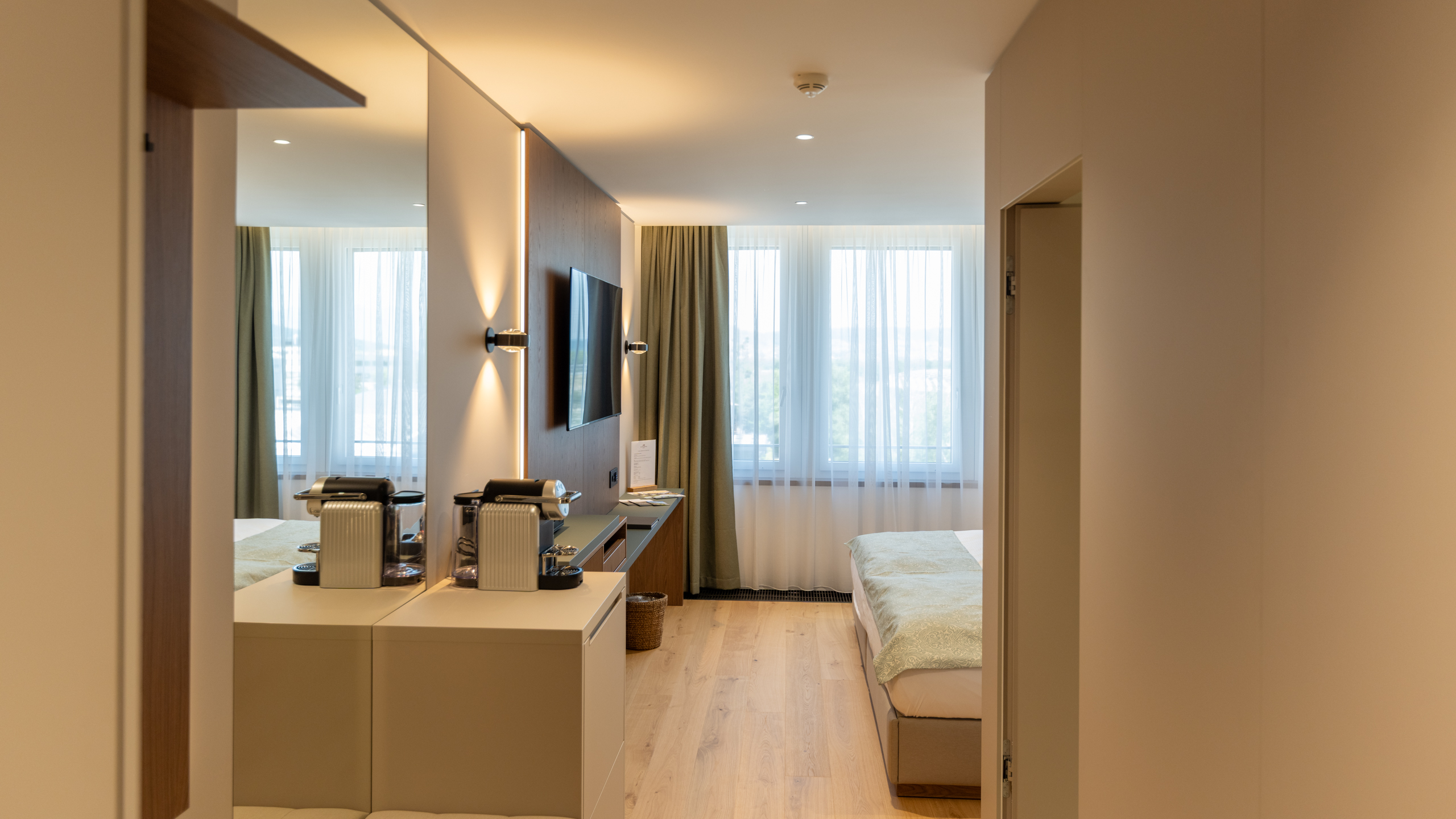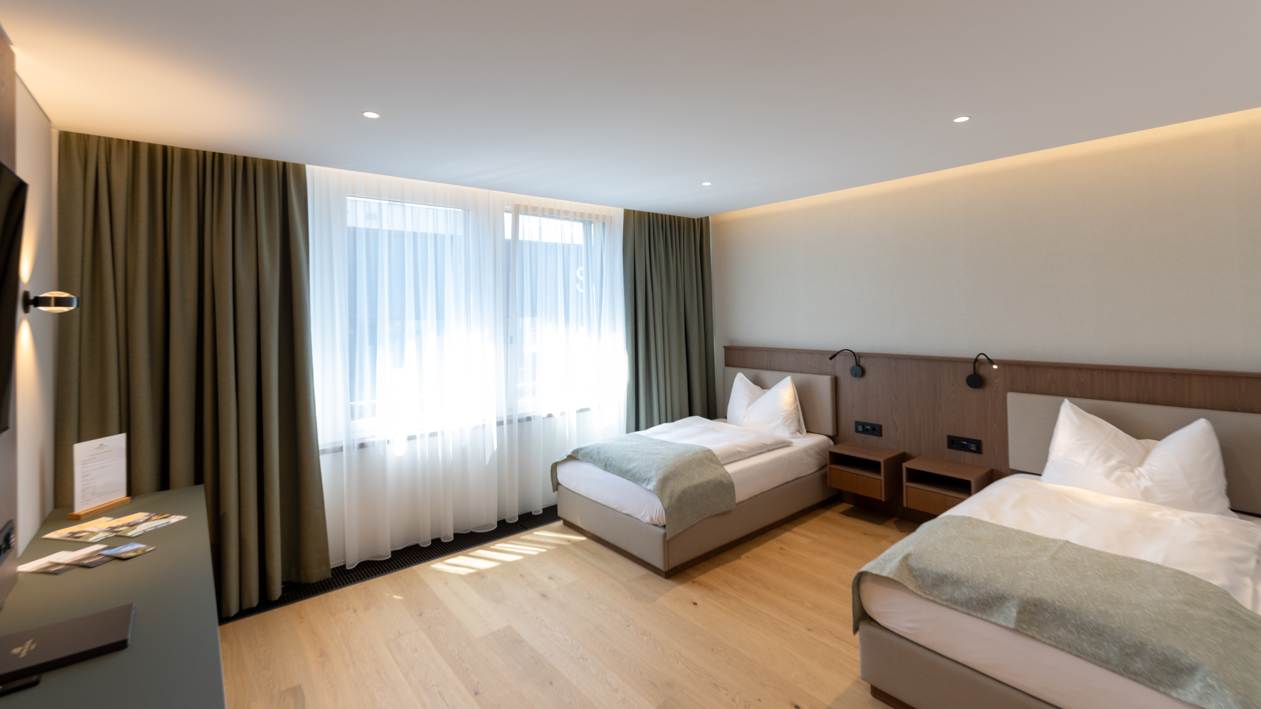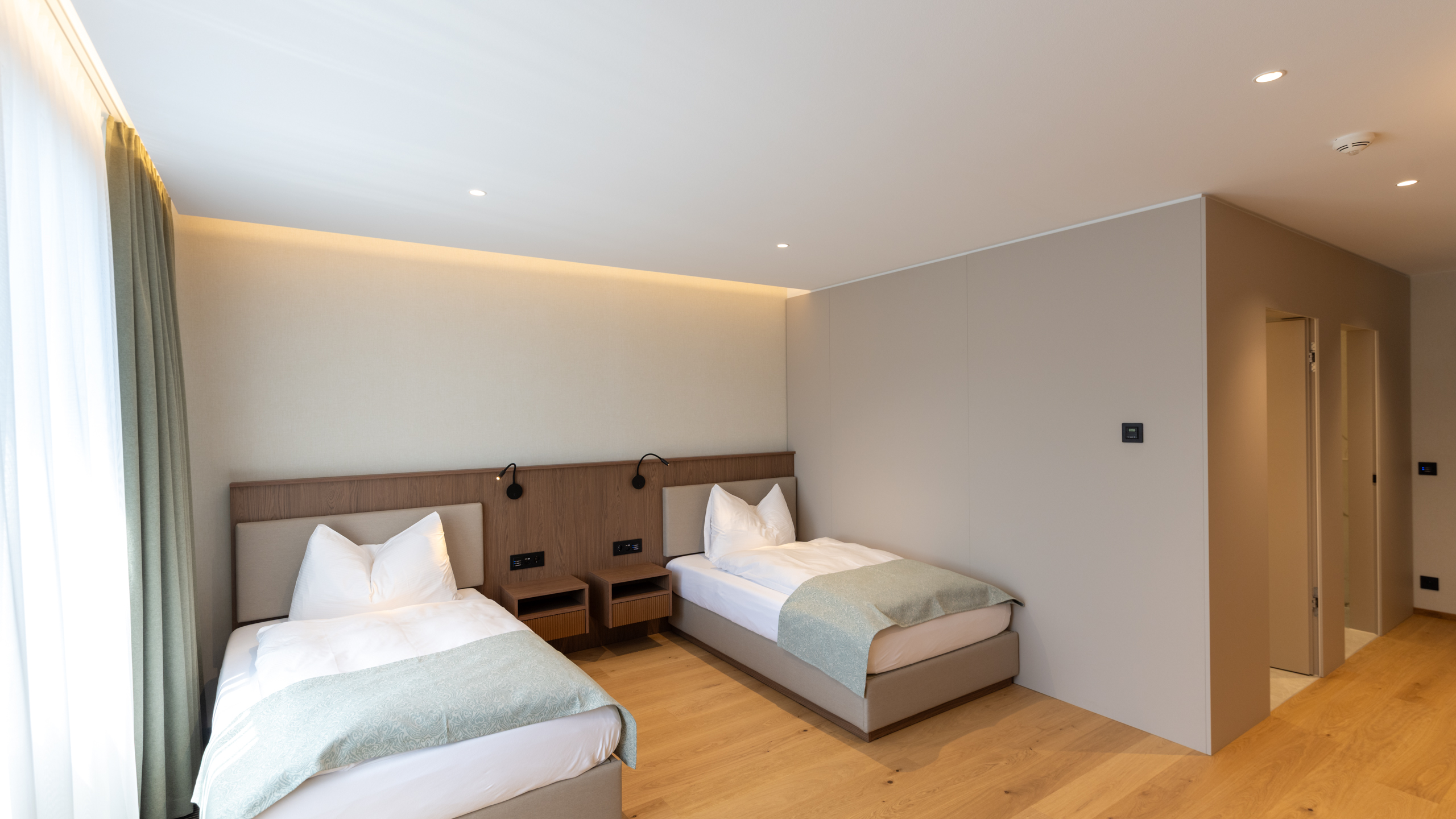 Die Junior Suite Zweibettzimmer im Alpin Royal Hotel in Liechtenstein bietet auf 36 m² viel Platz und Flexibilität. Zwei separate Betten, Mineralwasser, Nespresso-Kaffeemaschine, WLAN und Flachbildfernseher schaffen eine angenehme Atmosphäre. Starten Sie in den Tag mit einem Frühstück vom Buffet und geniessen Sie abends kulinarische Highlights oder Spiel, Spass und Spannung im Alpin Royal Casino. Das Frühstück ist im Zimmerpreis inkludiert.